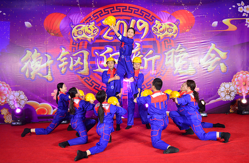 随后,晚会进入文艺演出环节。开场舞《盛世欢歌》首掀热潮。随后,由销售公司、技术中心、采购部、炼铁分厂、炼钢分厂、管加工分厂等部门组成的第一组,登台发表新年祝辞,展望2019年。趣味游戏《超凡判断力》集智慧、趣味为一体,激起了大家踊跃参与的热情。女声独唱《祖国你好》《越来越好》激起了现场春雷般的掌声。由公司舞蹈队自编、自导、自演,先后在长沙田汉大剧场、湘潭湘电工人俱乐部进行了慰问演出的舞蹈《咱们工人有力量》首次在自己的舞台进行演出。