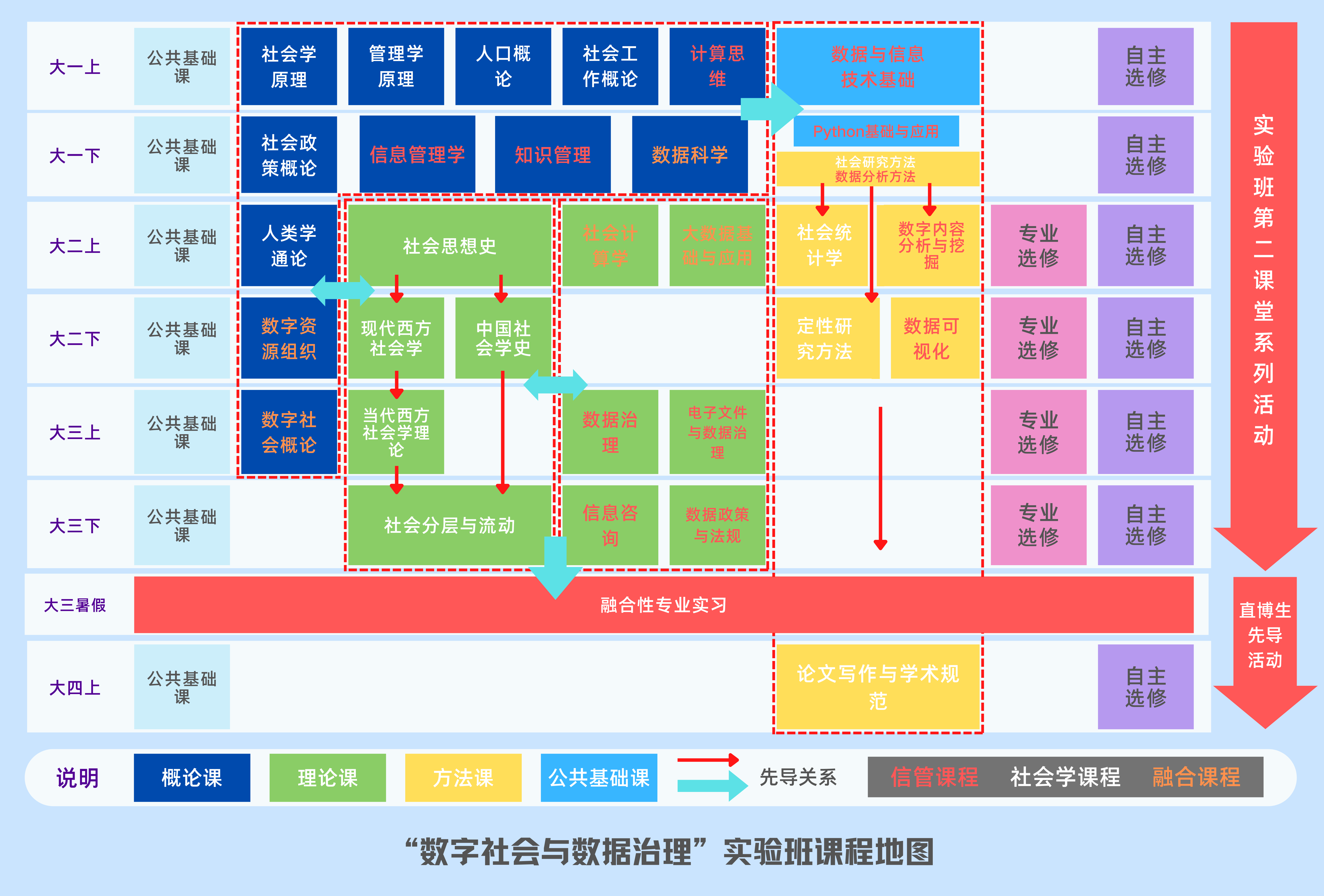“数字社会与数据治理实验班”(Digital Society and Data Governance)旨在面向数字化、智能化时代的需求,依托社会与人口公司社会学专业和信息资源管理公司信息资源管理专业,培养高素质、栋梁型数据管理应用人才。本实验班培养的人才将具备深厚的人文素养、扎实的公共管理和数据分析理论基础,具备全球视野和突出的创新能力,能够熟练掌握社会学理论与方法、熟练运用现代数据分析工具。