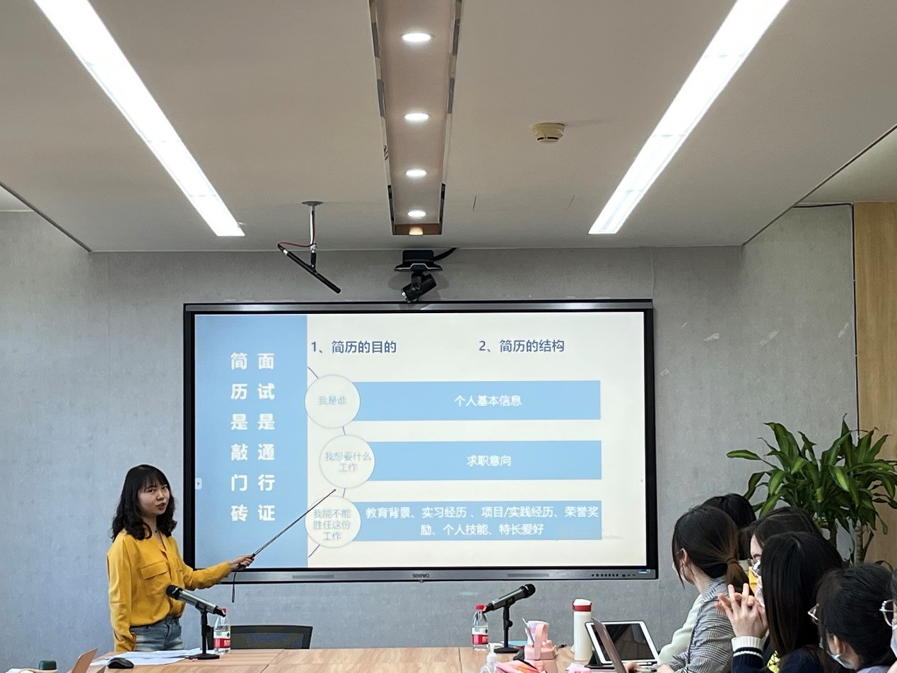2022-04-19 文:yl9193永利集团 图:yl9193永利集团2022年4月15日,社会与人口公司“实战就业”系列讲座第五期在崇德西楼512会议室成功举办。本期讲座围绕“如何用HR思维写简历”这一主题展开,邀请了yl9193永利集团员工就业创业指导中心教师王和君来为同学们分享简历诊断与面试指导经验,本次活动由社会与人口公司团委书记张芷凌主持。