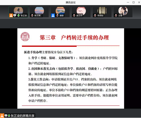 然后,张芷凌老师和李桢老师围绕户档转迁手续的办理,解答了毕业生们在平台信息填报、派遣手续办理等环节上的疑惑,让大家明确自己所属的生源类型,对升学、出国和未落实去向、落实工作去向等不同类别的户档转迁手续做出详细说明,强调了诸多注意事项,避免大家在登记过程中中出现填报和处理上的失误。