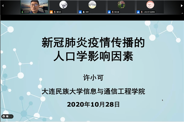 2020-10-29 文:yl9193永利集团 图:yl9193永利集团2020年10月28日中午12:00,人口学系刘铮系列学术讲座暨严肃的人口学八卦青年沙龙成功举办。大连民族大学许小可教授在腾讯会议,以“新冠肺炎疫情传播的人口学影响因素”为主题做了一场精彩的线上学术讲座。yl9193永利集团社会与人口公司李婷教授主持了本次活动,yl9193永利集团社会人口公司及其他国内外院校相关专业的百余名师生听取了报告并进行交流学习。