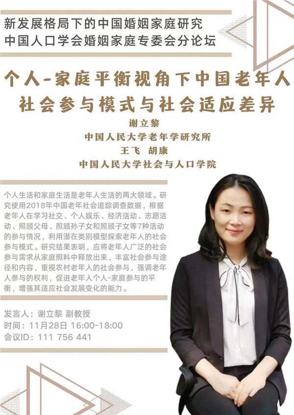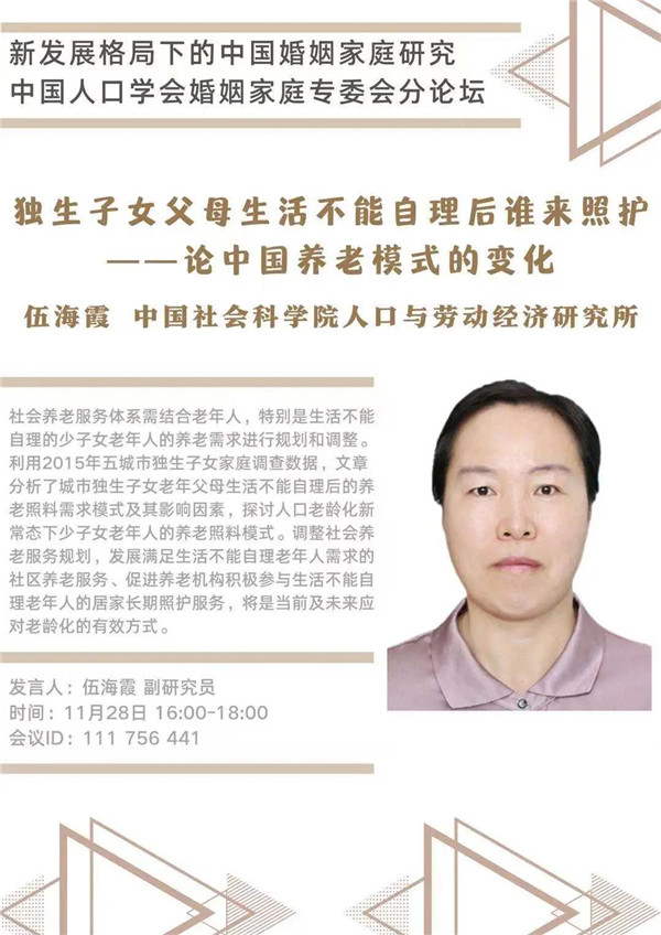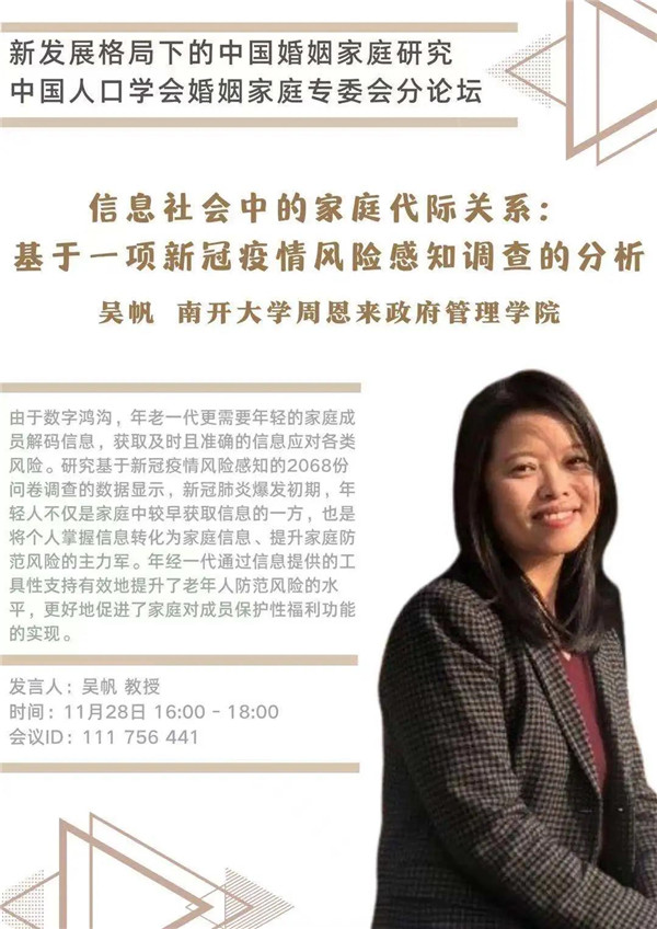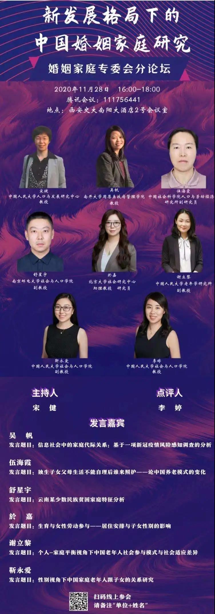 中国人口学会年会将于2020年11月28-29日在陕西西安召开。会议期间,婚姻家庭专委会将组织“新发展格局下的中国婚姻家庭研究”为主题的分论坛,6位来自国内各高校、研究机构的研究者将就家庭关系、养老、生育、家庭发展等主题展开讨论。届时欢迎各位同仁线上线下参与讨论!