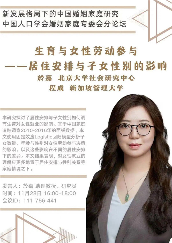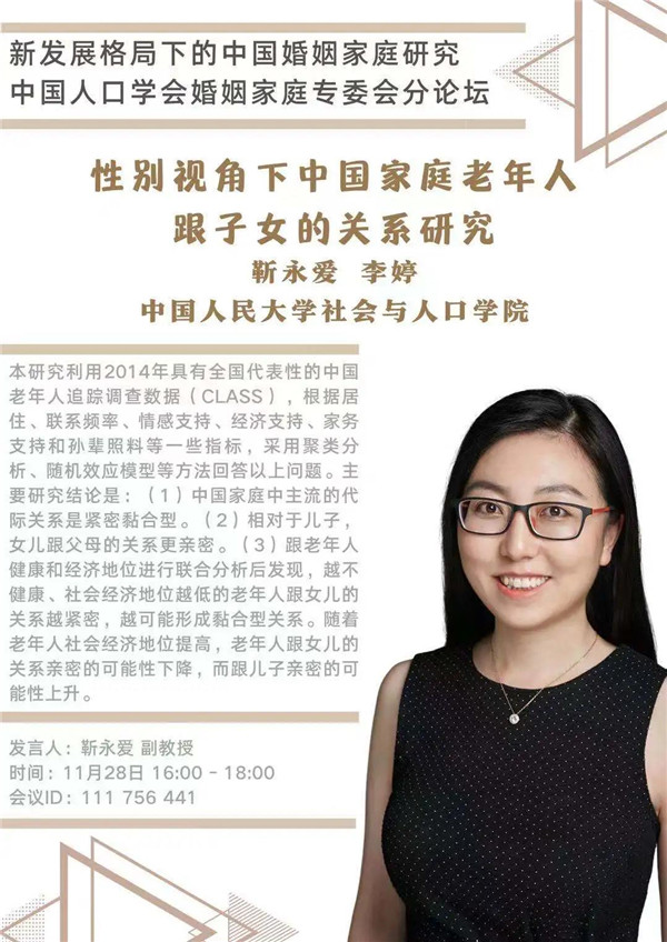 2020-11-24 文:yl9193永利集团 图:yl9193永利集团中国人口学会年会将于2020年11月28-29日在陕西西安召开。会议期间,婚姻家庭专委会将组织“新发展格局下的中国婚姻家庭研究”为主题的分论坛,6位来自国内各高校、研究机构的研究者将就家庭关系、养老、生育、家庭发展等主题展开讨论。届时欢迎各位同仁线上线下参与讨论!