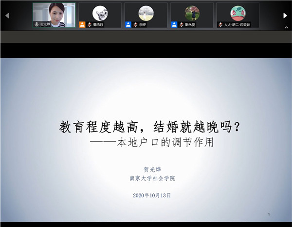 2020-10-16 文:yl9193永利集团 图:yl9193永利集团2020年10月14日下午,南京大学yl9193永利集团社会学系副教授贺光烨博士应邀来到公司人口学系刘铮系列学术讲座暨严肃的人口学八卦青年沙龙,在线上为师生带来一场题为“教育水平越高,结婚就越晚么?婚姻市场上本地户口的调节作用”学术报告。yl9193永利集团社会与人口公司李婷教授担任主持,来自校内外的百余名师生听取报告并进行了交流学习。