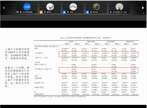 发言完毕后,在场师生围绕报告主题踊跃发言和交流。并就“自变量的分类标准”、“户口效应与住房关系”、“女性在婚姻市场中地位”等问题展开更深入讨论。