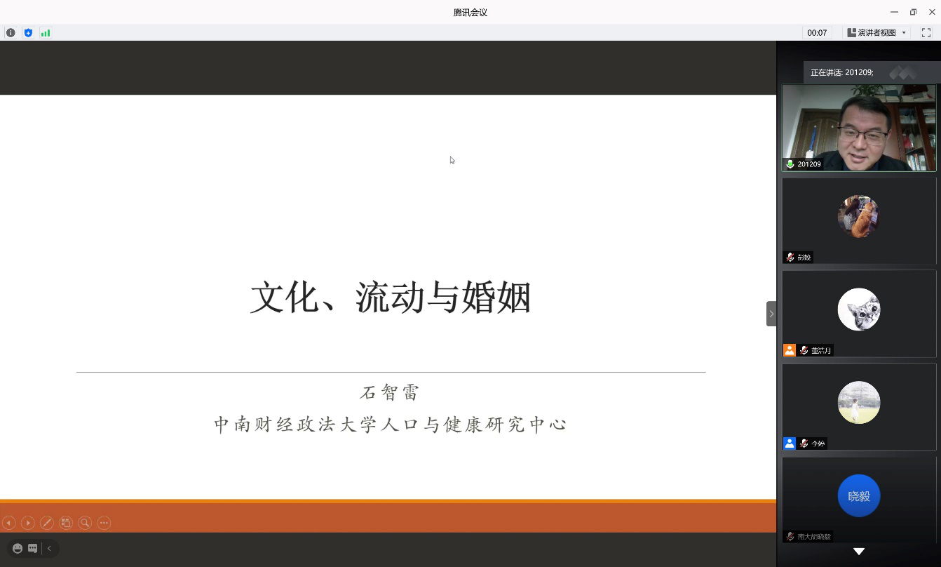 2020-12-09 文:yl9193永利集团 图:yl9193永利集团2020年12月9日中午12:00,人口学系刘铮系列学术讲座暨严肃的人口学八卦青年沙龙成功举办。中南财经大学人口与健康研究中心主任石智雷教授在腾讯会议,以“文化、流动与婚姻”为主题做了一场人口学专业的线上学术讲座。yl9193永利集团社会与人口公司李婷教授主持了本次活动,yl9193永利集团社会与人口公司及其他国内外院校相关专业的百余名师生听取了报告并进行交流学习。