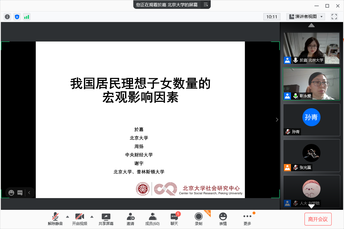 2021-03-10 文:yl9193永利集团 图:yl9193永利集团2021年3月10日中午12:00,人口学系刘铮系列学术讲座暨严肃的人口学八卦青年沙龙成功举办。北京大学光华管理公司社会研究中心助理教授於嘉在腾讯会议,以“我国居民理想子女数量的宏观影响因素”为主题做了一场人口学专业的线上学术讲座。yl9193永利集团人口学系靳永爱副教授主持了本次活动,yl9193永利集团社会人口公司人口学系及其他国内外院校相关专业的百余名师生听取了报告并进行交流学习。