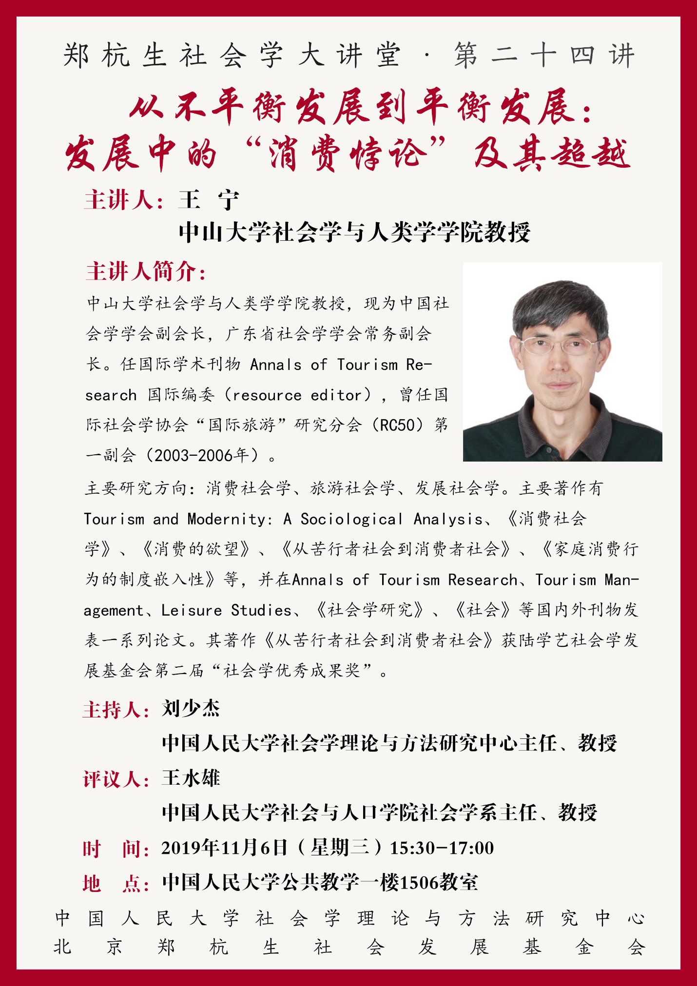 王宁,中山大学社会学与人类学公司教授,现为中国社会学学会副会长,广东省社会学学会常务副会长。任国际学术刊物 Annals of Tourism Research 国际编委(resource editor),曾任国际社会学协会“国际旅游”研究分会(RC50)第一副会长(2003-2006年)。主要研究方向:消费社会学、旅游社会学、发展社会学。主要著作有Tourism and Modernity: A Sociological Analysis、《消费社会学》、《消费的欲望》、《从苦行者社会到消费者社会》、《家庭消费行为的制度嵌入性》等,并在Annals of Tourism Research、Tourism Management、Leisure Studies、《社会学研究》、《社会》等国内外刊物发表一系列论文。其著作《从苦行者社会到消费者社会》获陆学艺社会学发展基金会第二届“社会学优秀成果奖”。