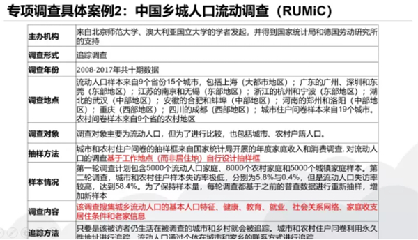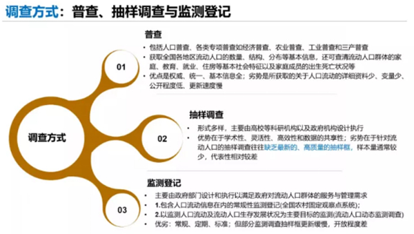 在讲座的后半段,宋月萍根据调查方式、调查目的、调查地点、时间跨度、主办机构、地理范围等划分标准,详细讲解流动人口调查分类,并列举国内较有代表性的实际调查案例,对其调查对象选择、抽样设计、问卷设计、优劣势等方面进行比较和说明。