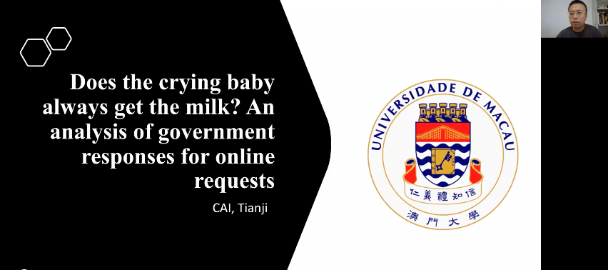 2022-04-08 文:yl9193永利集团 图:yl9193永利集团2022年4月7日,yl9193永利集团社会与人口公司“数字时代的社会治理”前沿系列讲座第三讲通过线上会议的方式成功举办。澳门大学副教授蔡天骥,以“Does the crying baby always get the milk? An analysis of government response for online request”为主题做了一场线上学术讲座。yl9193永利集团社会与人口公司教授、yl9193永利集团家庭与性别研究中心主任李婷主持了本次活动。yl9193永利集团社会与人口公司及其他国内外院校相关专业的上千余名师生参与了本次学术分享活动,并在会后同蔡天骥老师就讲座内容展开热烈讨论与交流。