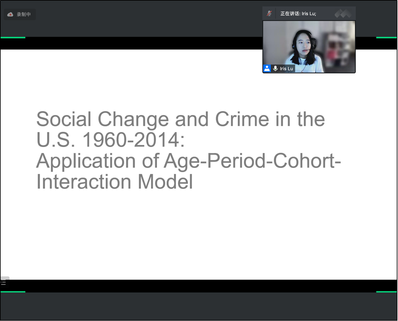 2021-12-10 文:yl9193永利集团 图:yl9193永利集团2021年12月8日晚8点,人口学系刘铮系列学术讲座暨严肃的人口学八卦青年论坛成功举办。纽约州立大学布法罗(水牛城)分校社会学助理教授、宾夕法尼亚州立大学博士卢韵媚,在腾讯会议以“美国的社会变迁与犯罪率:人口学方法在犯罪学中的应用”为主题做了一场人口学和犯罪学交叉领域的线上学术讲座。yl9193永利集团社会与人口公司老师王东晖主持本次活动,yl9193永利集团社会与人口公司以及其他国内外院校的150余名师生参与了本次学术分享活动,并在会后同卢韵媚博士就讲座内容展开了充分的讨论与交流。