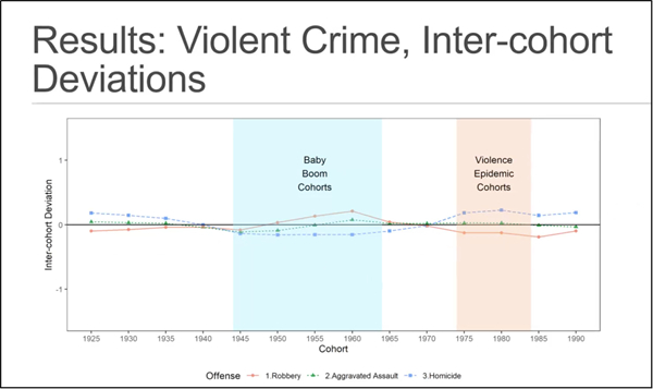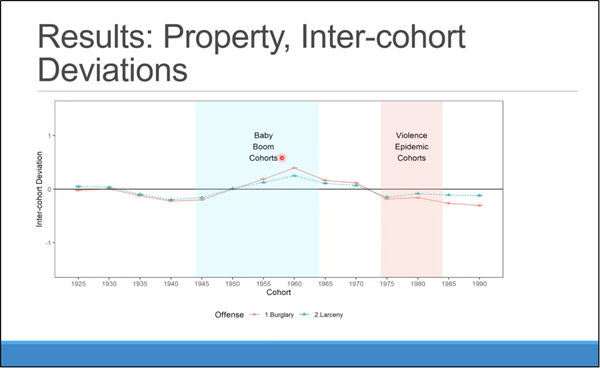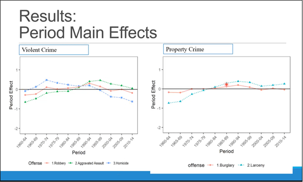 卢韵媚博士本次讲座分享的研究聚焦于美国犯罪率在年龄、时期和队列视角上的变迁,利用美国联邦调查局统一犯罪报告(FBI Uniform Crime Report)1960-2014年数据,基于APC-I(Age-Period-Cohort-Interaction)模型对美国暴力犯罪率和财产犯罪率的社会变迁进行了详细的分析。卢韵媚博士首先对美国社会学领域犯罪学研究进行了简单的介绍,从而引出自己讲座的主题:人口学方法在犯罪学中的应用。接着卢韵媚博士对年龄效应、时期效应和队列效应进行了详细的解释:年龄效应是指随着时间的推移,年龄增长的普遍影响,例如随着年龄的增长死亡风险会增加;时期效应是影响所有群体的社会和历史变化;队列效应是其研究关注的重点,出生在相同年份的人受到在特定时期和特定年龄经历相同事件的独特影响。由于年龄、时期和队列存在完全共线,无法很好的分析犯罪率的三种效应,传统的APC模型也存在不少缺陷,APC-I模型较好的解决了传统模型存在的问题并且能够更加深入地分析队列效应。结果分析中,年龄效应发现犯罪风险随着年龄的增长而下降,财产犯罪的高峰年龄区间(15-19岁)要低于暴力犯罪的高峰年龄区间(20-24岁)。时期效应发现美国暴力犯罪趋势在上世纪六七十年代呈现上升趋势,八十年代后下降;财产犯罪自二十世纪六十年代以来呈现上升趋势,八十年代达到高峰后保持稳定。队列效应发现在二十世纪八十年代和九十年代出生的人在到达主要犯罪年龄后有较高的杀人犯罪风险。而婴儿潮一代,特别是婴儿潮后期出生的人(出生于六十年代)卷入财产犯罪的风险更高。