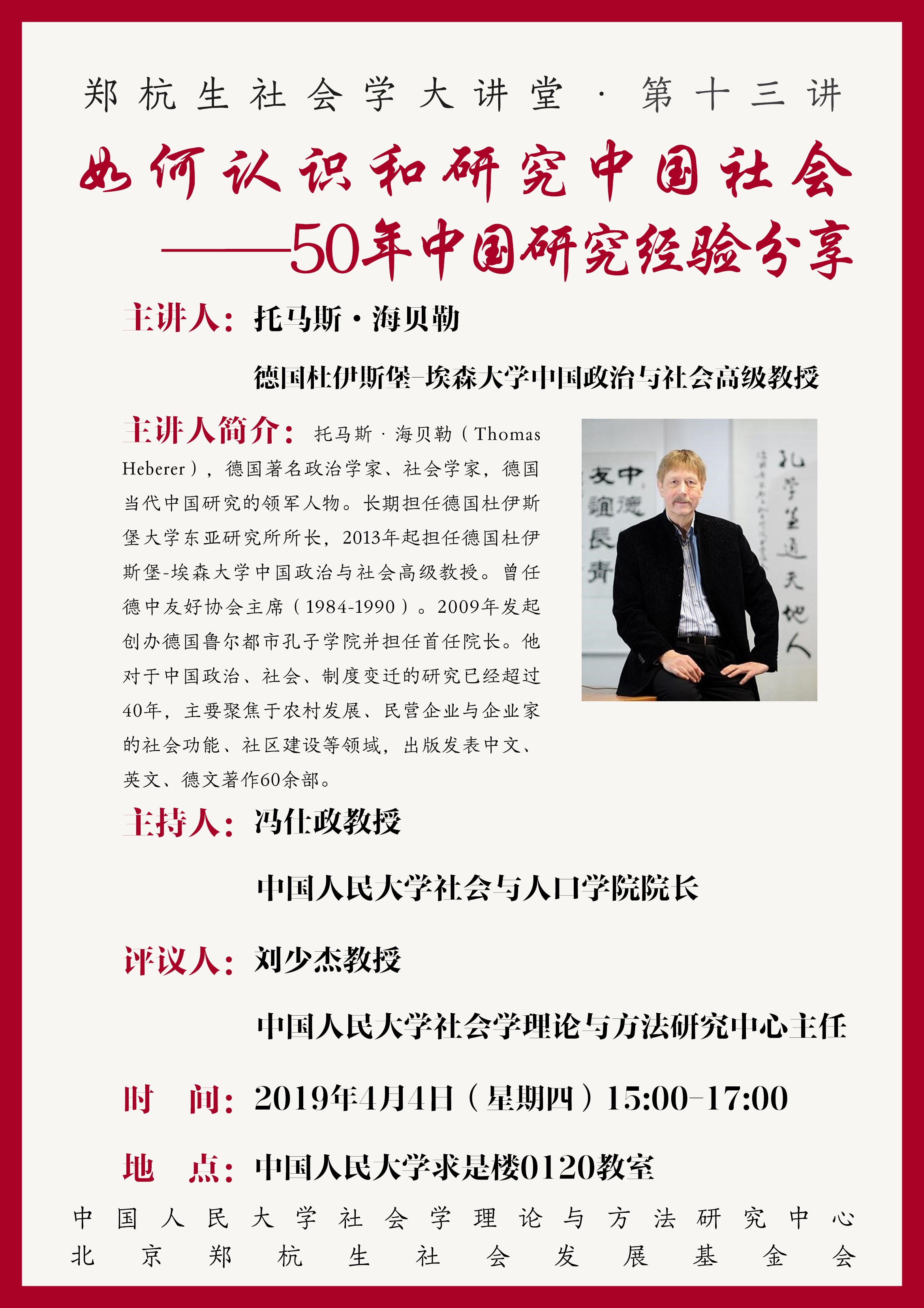 托马斯·海贝勒(Thomas Heberer),德国著名政治学家、社会学家,德国当代中国研究的领军人物。长期担任德国杜伊斯堡大学东亚研究所所长,2013年起担任德国杜伊斯堡-埃森大学中国政治与社会高级教授。曾任德中友好协会主席(1984-1990)。2009年发起创办德国鲁尔都市孔子公司并担任首任经理。他对于中国政治、社会、制度变迁的研究已经超过40年,主要聚焦于农村发展、民营企业与企业家的社会功能、社区建设等领域,出版发表中文、英文、德文著作60余部。