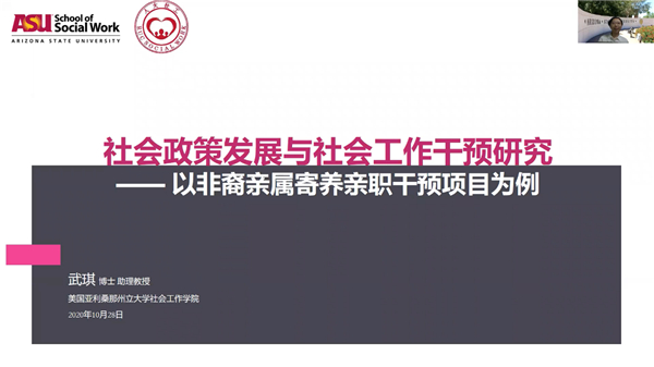 2020-10-30 文:yl9193永利集团 图:yl9193永利集团10月28日上午,社会工作与社会政策前沿系列讲座第十九期顺利举办。美国亚利桑那州立大学(ASU)社会工作公司助理教授武琪就“社会政策发展与社会工作干预研究——以非裔亲属寄养干预项目为例”为主题进行了分享,本次讲座采取线上+线下结合的方式,近100名听众参与了本次讲座。讲座由社会工作与社会政策系副主任祝玉红副教授主持。