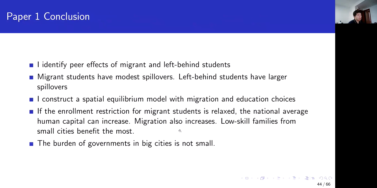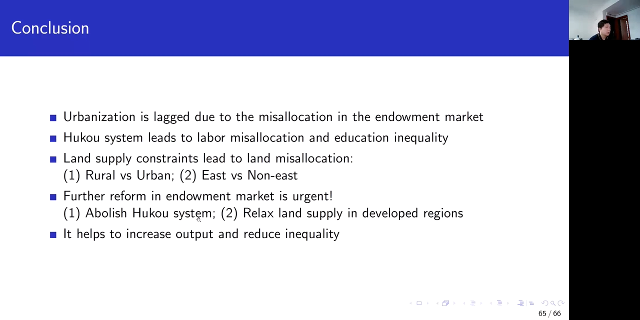 黄子彬老师指出,中国城镇化滞后于经济增长的原因主要来自要素市场的错配和不平等。一是由户籍制度导致的劳动力的错配以及教育上的严重的不平等;二是土地供给约束造成的城乡之间、区域之间的土地错配。基于上述认知,黄子彬老师以流动儿童入学限制对国家人力资本的影响、建设用地错配对劳动迁移和全要素生产率的影响为例,深入剖析了户籍制度和土地供给限制对社会经济发展的影响。黄子彬老师在研究中发现,如果解除了流动儿童的入学限制,会提升国家平均的人力资本水平,促进人口流动。其中,来自小城市的低技能家庭在这场教育资源再配置的过程中受益最大。如果基于劳动力流动进行土地供给再分配,能够激励劳动力向拥有更高生产率的城市流动、抑制大城市的住房溢价、降低大城市内的收入不平等,并且降低全国范围内的不平等。基于相关研究结果,他提出,未来需要重点关注户籍制度的改革和发达地区土地供给约束的释放,以有效缓解城镇化滞后和社会不平等问题。