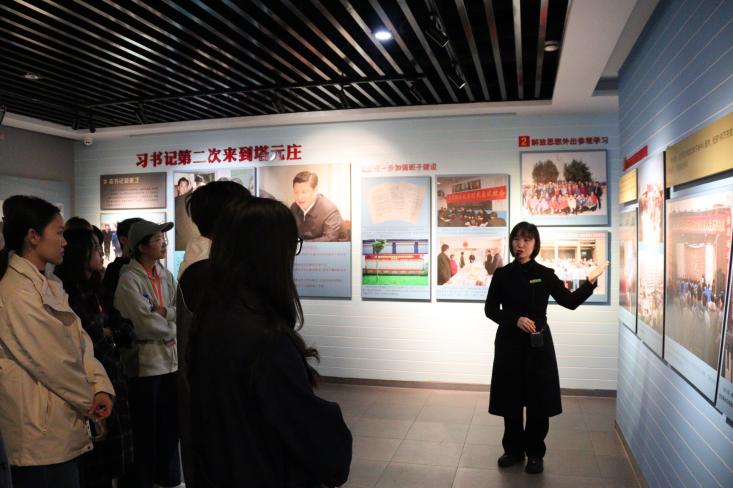随后,同学们前往正定县,观摩学习塔元庄村产业兴、农民富、农村美的乡村振兴之路。穿过塔元庄文化长廊,观看塔元庄全家福、历史变迁今昔对比、魅力乡村特色富民、塔元庄文化建设等系列主题照片,同学们深入了解了塔元庄振兴发展的历史经验。在村史馆内,讲解员详细讲述了塔元庄如何在习近平总书记的关怀与指导下,从贫穷落后的小村庄蝶变为现代化新农村的故事。通过观看纪录片《蝶变塔元庄》,同学们直观感受到了塔元庄翻天覆地的变化,塔元庄正以全新的面貌展示着乡村振兴的壮丽画卷。
