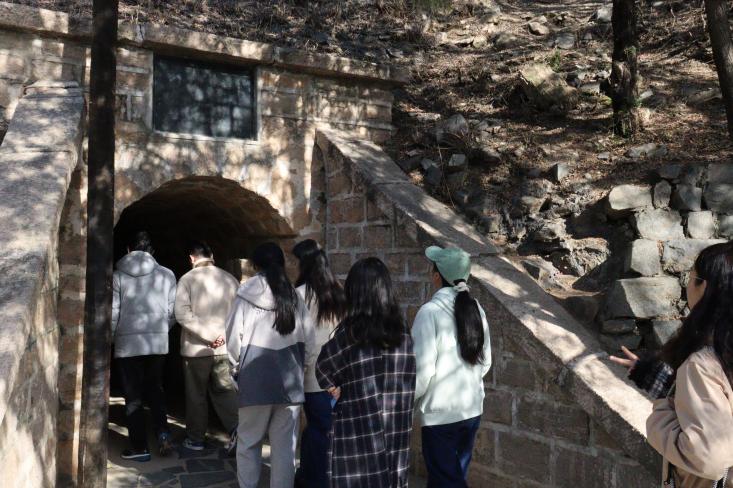 接下来,同学们来到西柏坡中共中央旧址,逐一参观了老一辈革命家的旧居。敞亮的房间、干净的书案、整洁的床榻,展现了老一辈革命家的简朴与认真。穿过防空洞、参观中央军委作战室、踏入革命前辈的办公室,同学们仿佛能够听到当年那些激动人心的口号声,感受到革命领导人们坚定的信念和决心。踏上红色的土地、贴近历史的脉搏,让同学们更加深刻地理解了革命胜利的来之不易。
