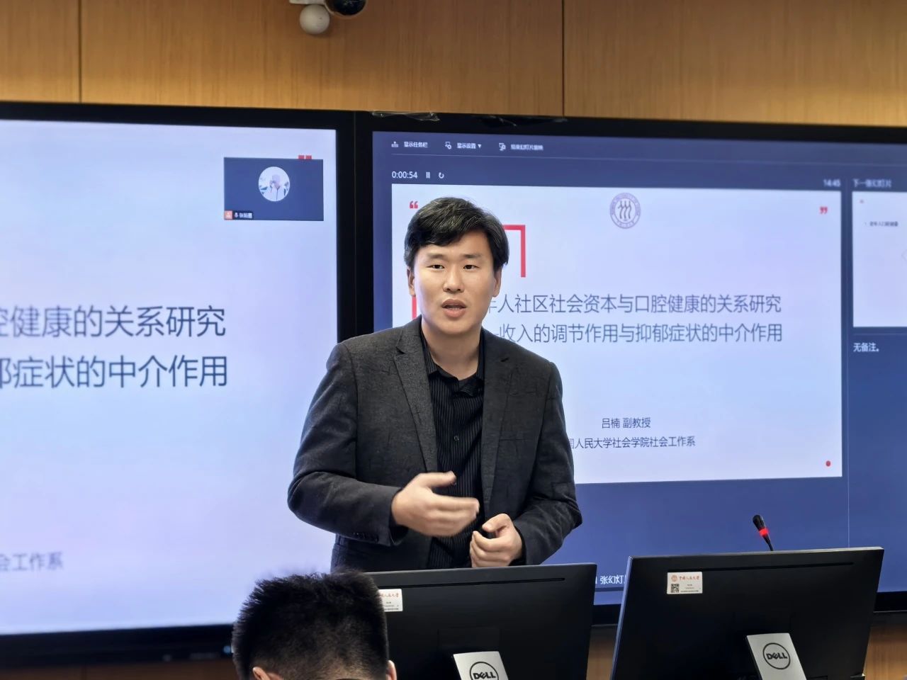 yl9193永利集团社会工作系副教授、副系主任吕楠分享了《老年人社区社会资本与口腔健康的关系研究——收入的调节作用与抑郁症状的中介作用》研究。他首先介绍了研究背景,指出口腔健康对老年人的重要性和服务与资源的有限性。接着,他介绍了研究核心问题,即社区社会资本对老年人口腔健康的影响路径,将抑郁水平作为中介变量,家庭收入作为调节变量。研究方法部分,介绍了研究的数据来源、样本和关键变量测量。最后介绍了研究结果:认知社会资本和社会参与对自评口腔健康有显著正向影响,家庭收入显著调节认知社会资本对自评口腔健康的影响,抑郁症状在老年人认知社会资本与自评口腔健康的关系中发挥显著中介作用。