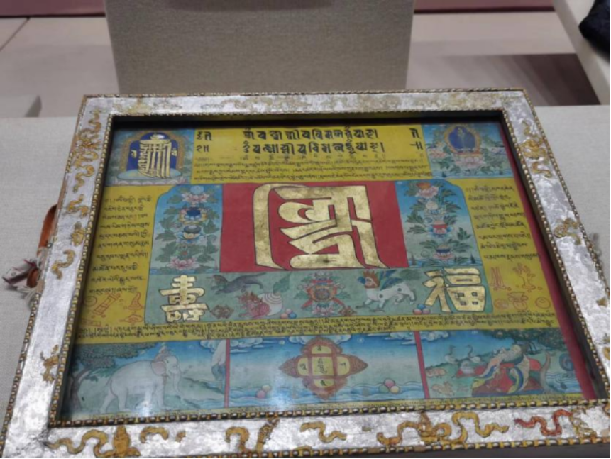 我个人比较关注文字方面的材料,特别有印象的一件展品是藏族唐卡《福寿》。这件展品用汉藏两文的福寿字样和象征吉祥如意的大象、象征长寿的寿星仙鹤等团元素编织而成,用生动活泼的形式表达着中华民族对“福寿双全”的共同向往和追求。