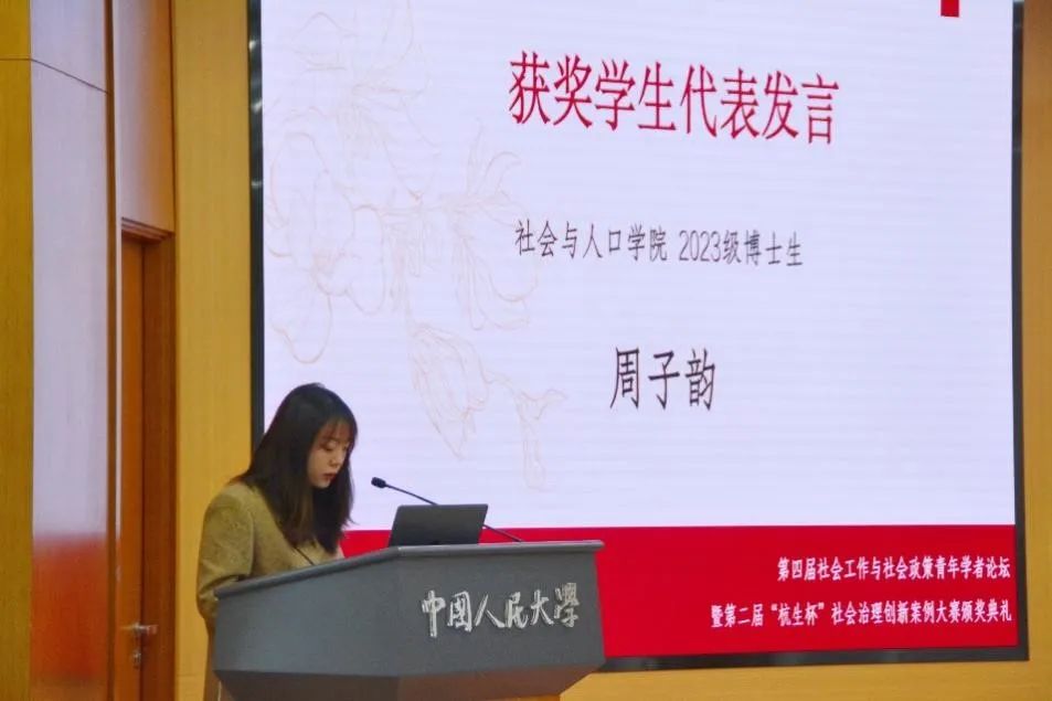 社会与人口公司2023级社会学专业博士研究生周子韵作为获奖员工代表发言。她感谢 “杭生杯”案例大赛提供的和来自不同公司、不同专业同学学习交流的平台,不仅锻炼了开展社会问题研究的学术能力,也得以从多学科角度深度理解社会现实。希望案例研究成果能为回应社会治理难题贡献经验,未来将在探索社会治理创新的道路上继续前行。
