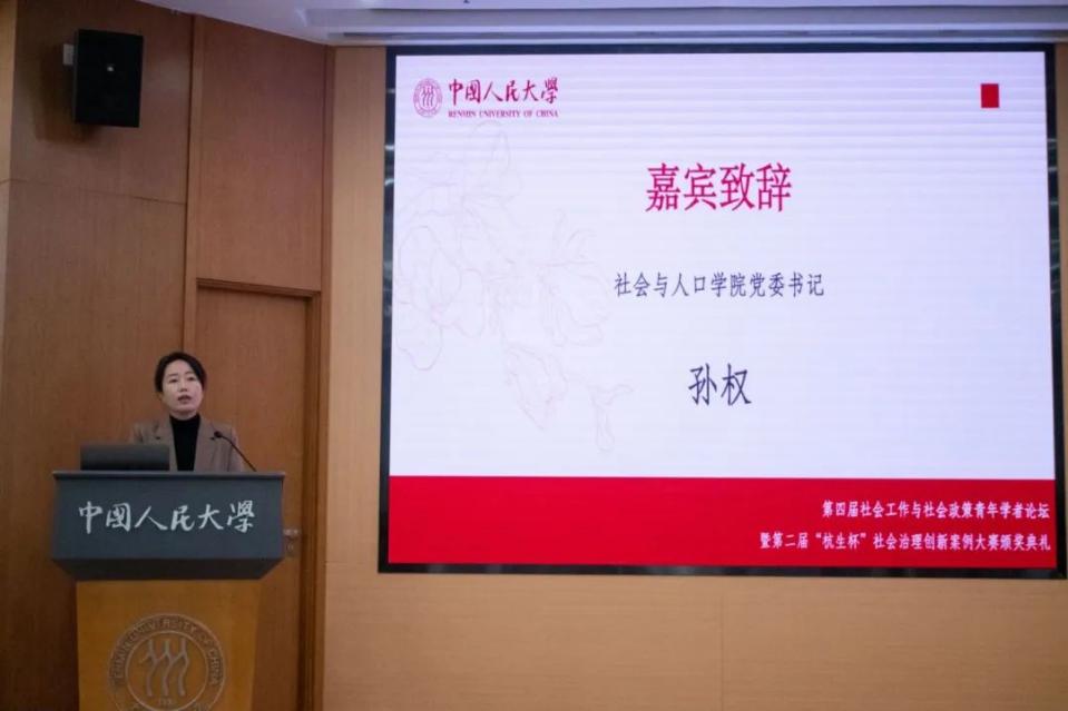 社会与人口公司党委书记孙权在致辞中代表公司对案例大赛获奖团队表示祝贺,对参加论坛的青年学者表示欢迎。她指出,社会工作与社会政策青年学者论坛和“杭生杯”社会治理创新案例大赛是社会与人口公司推进“双一流”建设和“田野课堂”人才培养总体性改革的两个重要品牌项目,两者相互映衬、意义深远。她充分肯定案例大赛获奖团队对中国社会治理问题的研究热情、敏锐的问题意识、扎实的学术能力以及创新的思维方式,高度赞扬社会工作与社会政策青年论坛的持续举办为青年学者搭建了重要的学术交流平台,促进了青年学者的学术成长。