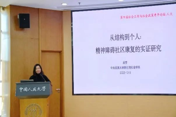 中央民族大学民族学与社会学公司吴莹副教授报告了精神障碍社区康复的多项实证研究成果,从文化契合性的角度剖析精神康复共同体的建构,分析了精神障碍社区康复从“去机构化”到“再机构化”转变的逻辑,探讨了职业康复对青年精神障碍者的再社会化的影响。