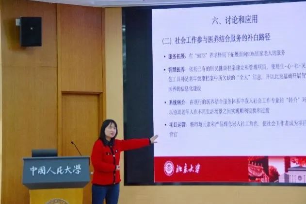 论坛由社会工作与社会政策系主任谢立黎主持。北京大学社会学系助理教授陈海萍基于对北京5家养老机构的深度调研,分析了养老服务供需对接的现实障碍,提出了社会工作参与医养结合服务的增效路径和补白路径。