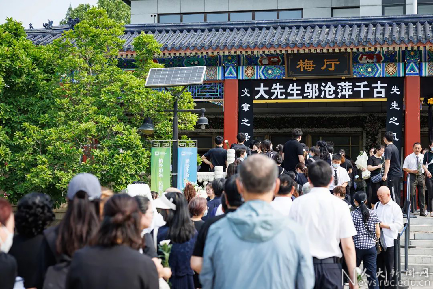 17日上午9时,告别仪式开始。梅厅庄严肃穆,哀乐低回,上方悬挂黑底白字的横幅“沉痛悼念邬沧萍同志”。人们佩戴着白花缓缓步入,送别邬沧萍教授最后一程,并和家属一一握手,请他们节哀保重。